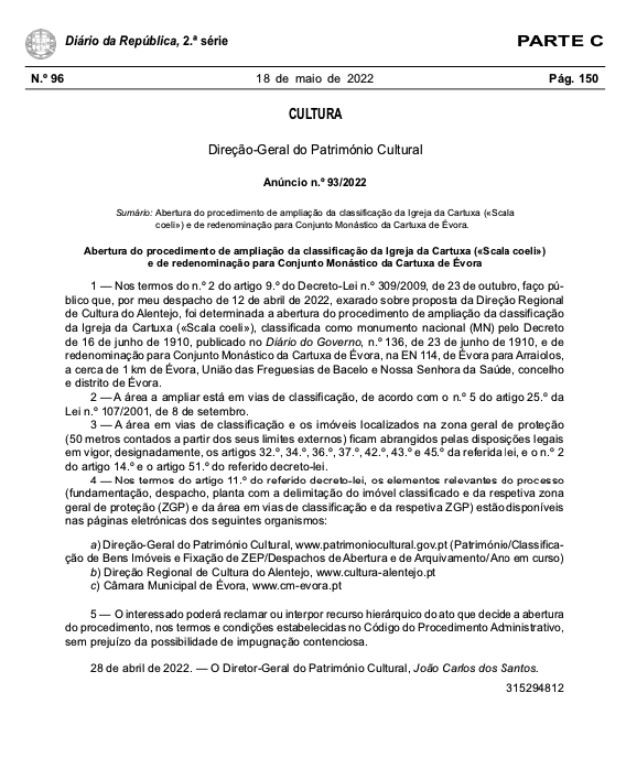 Após diversas vicissitudes processuais, foi finalmente aberto, pela Direcção-Geral do Património Cultural, o "procedimento de ampliação da classificação da Igreja da Cartuxa («Scala Coeli») e de redenominação para Conjunto Monástico da Cartuxa de Évora" como Monumento Nacional.